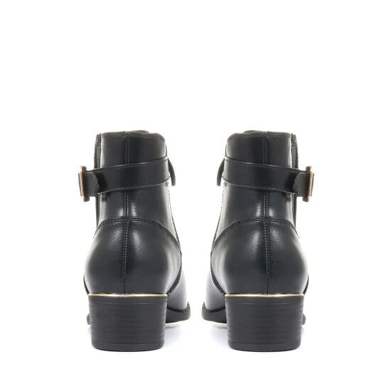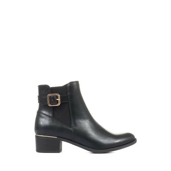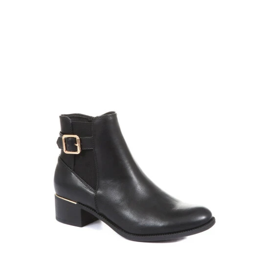 A classic ankle boot is a stylish and practical addition to any woman’s wardrobe, and will give endless styling opportunities in a whole range of settings. Crafted from beautiful faux leather, these ladies’ ankle boots are styled with an elastic panel and a single strap with a metallic buckle. Closed with a discrete inside zip, the boots are sat upon a low, stacked heel for a subtle boost of height.