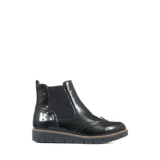 A contemporary hybrid of traditional styles, this ladies’ ankle boot combines the classic profile of a Chelsea boot with time-honoured brogue puncturing. Designed with deep elastic side panels for a heritage feel, the boots are imagined in a high-shine finish, decorated with the broguing at the toe and heel. Lined with soft leather textile for a comfortable fit, the boots are finished with an inside zip for easy put on.