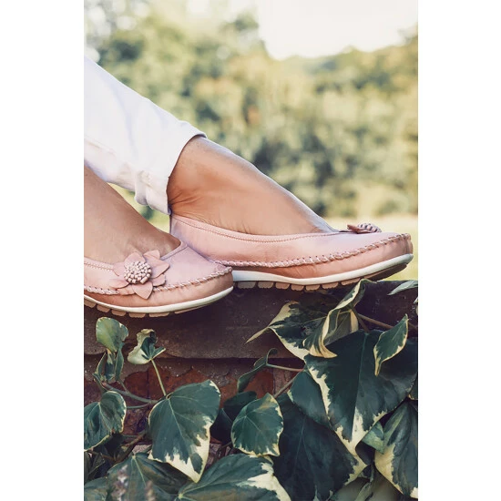 A decorated choice for your casual styling, our leather pump is decorated with an intricate flower embellishment. Crafted with a durable leather upper and lined purely with soft supple leather with a cushioned footbed and arch support, an ideal choice for ladies with a high in-step, the shoe sits on an ultra flexible rubber sole offering dependable gripped support though your causal occasions.